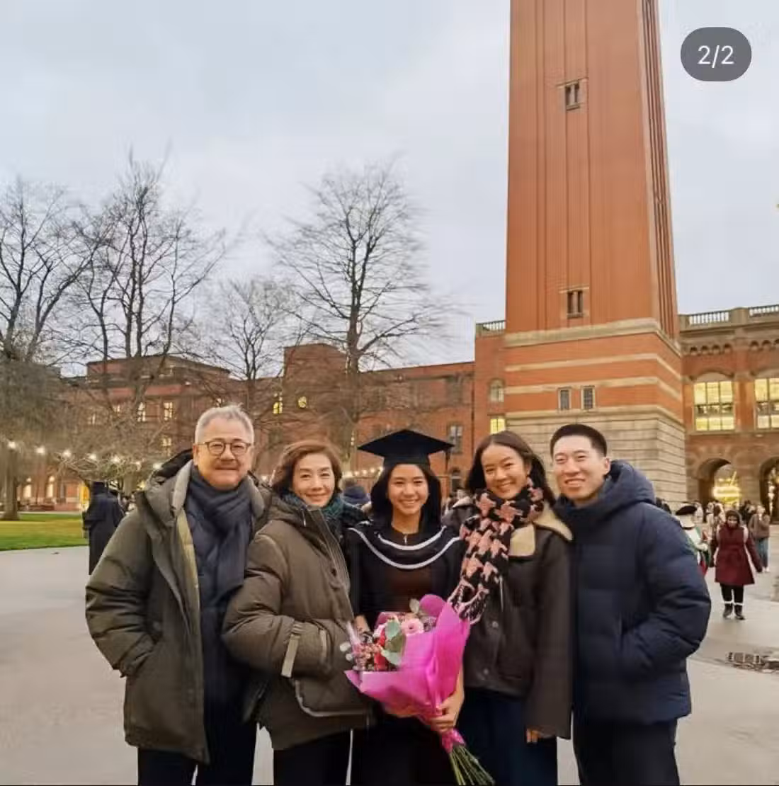 毛舜筠一家人齊聚英國,她曬出全家福。毛舜筠的全家福並不少見,不過這一張全家福格外不同,不同之處是大女兒的對象首次以女婿的身份露臉。從合照來看,一家人在伯明罕校園內標誌建築物下留影,小女兒戴著四方帽穿著畢業袍,手捧著一束鮮花站在中間,大女兒與女婿站在一邊,毛舜筠與丈夫站在另一邊。合照中毛舜筠的第三任丈夫最顯眼,他頭髮已經全白,顯得非常慈祥,畢竟已經79歲了,倒是毛舜筠顯得很年輕,而兩個女兒樣子長得很像,其中大女兒最像毛舜筠。