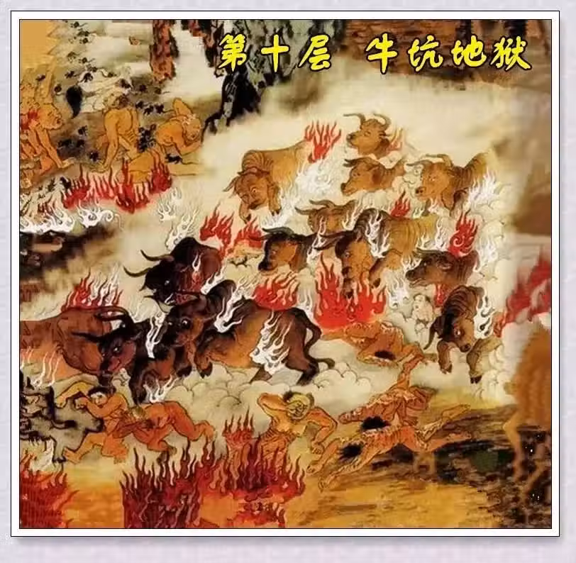 投入坑中,無數隻牛襲來,牛角頂,牛蹄踩,牛身燃火,觸之即焚成灰燼。