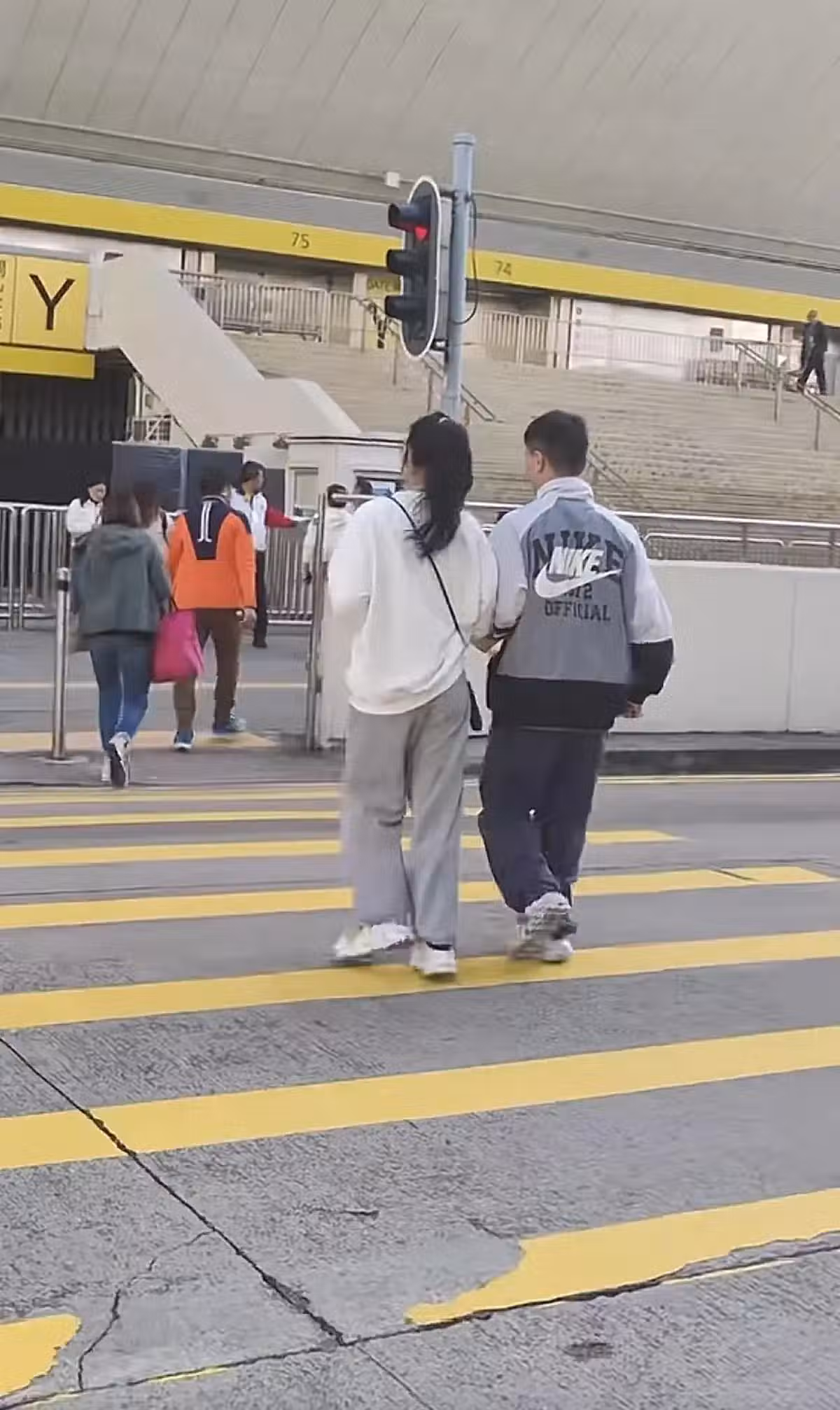這次的賴文慧沒有穿外套,穿的是白色的衛衣,灰色的寬鬆褲子,戴黑色的口罩,與一位穿運動服的年輕男子急急匆匆拿著咖啡往前走。