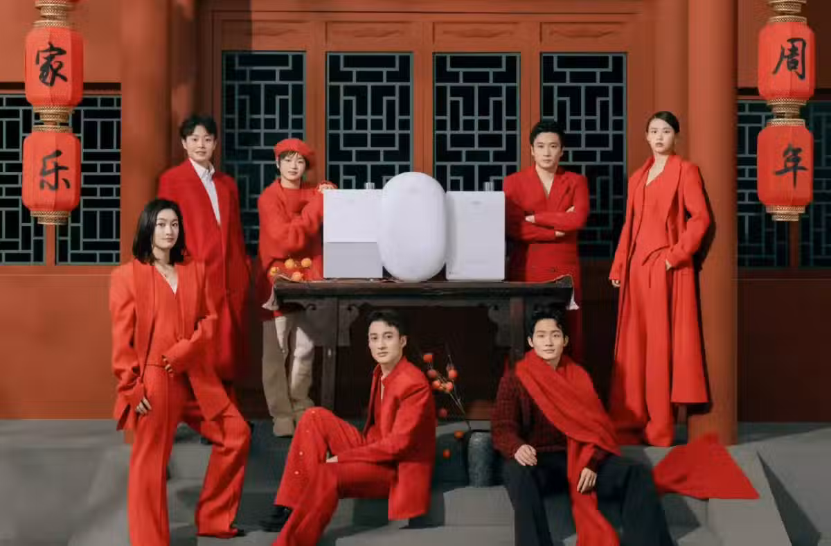 喜迎新年最喜慶的一款是大家穿上紅色服飾。練俊傑穿了紅色西服,王宗源肩上披了紅色圍巾,兩人坐在台階上。昌雅妮穿了紅色的西服,一腳踏在台階上真的太酷了。陳芋汐穿了紅色長衫靠在立柱上,盡顯美艷一面。陳藝文穿了紅色長衫也靠在立柱上。全紅嬋戴了紅色帽子站在桌後面,這個造型很美。曹緣雙手抱臂站在桌後面。