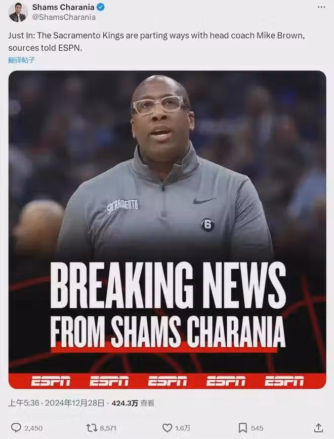 12月28日,據ESPN名記Shams報道,國王隊和主教練邁克-布朗正式解約,雙方分道揚鑣,助教道格-克里斯蒂將擔任國王臨時主帥。值得一提的是,今年休賽期,國王剛跟邁克-布朗續約,3年3000萬美元,2027年到期。