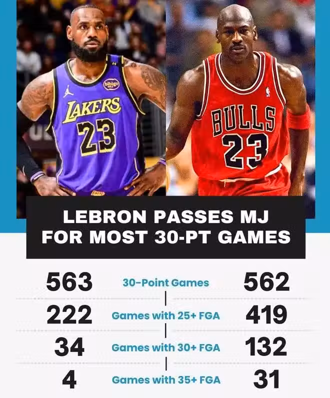 這份數據要表達的意思很明確,雖然詹姆斯打破喬丹的30+場數紀錄多用了450場,但他的平均出手數遠低於喬丹。換言之,美媒認為喬丹的紀錄建立在更多的出手上,如果詹姆斯願意這樣打球,他早就打破30+得分的紀錄。