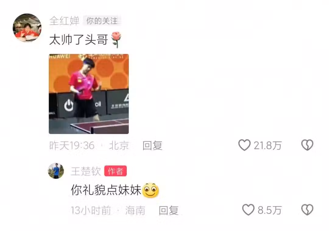 這也讓很多人好奇全紅嬋到底有多少王楚欽的動圖,反正你斗動圖肯定是鬥不過全紅嬋。
