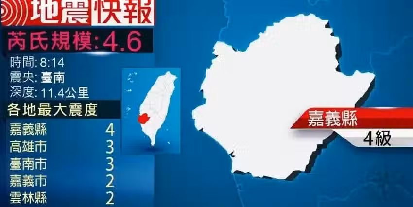 地牛翻身!8:14 、8:41台南發生規模地震,最大震度曝光