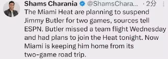Shams:巴特勒因錯過球隊航班,被禁賽兩場。