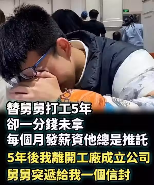 替舅舅打工5年,卻一分錢未拿,每個月發薪資他總是推託,5年後我離開工廠成立公司,舅舅突遞給我一個信封