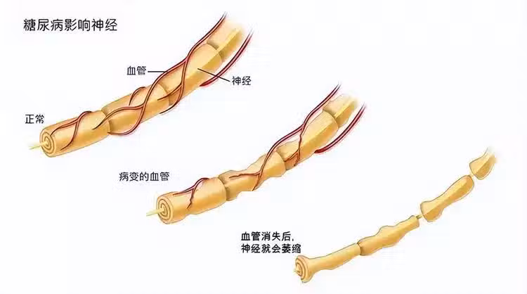 糖尿病神經的病變是導致非創傷性下肢截肢手術的主要原因。其中周圍神經的病變表現為由最初的肢端感異常發展為肢痛進而造成運動神經的受累。自主神經的損害可較早的出現,表現為瞳孔的改變、排汗異常、胃腸功能紊亂、泌尿系統功能紊亂等。