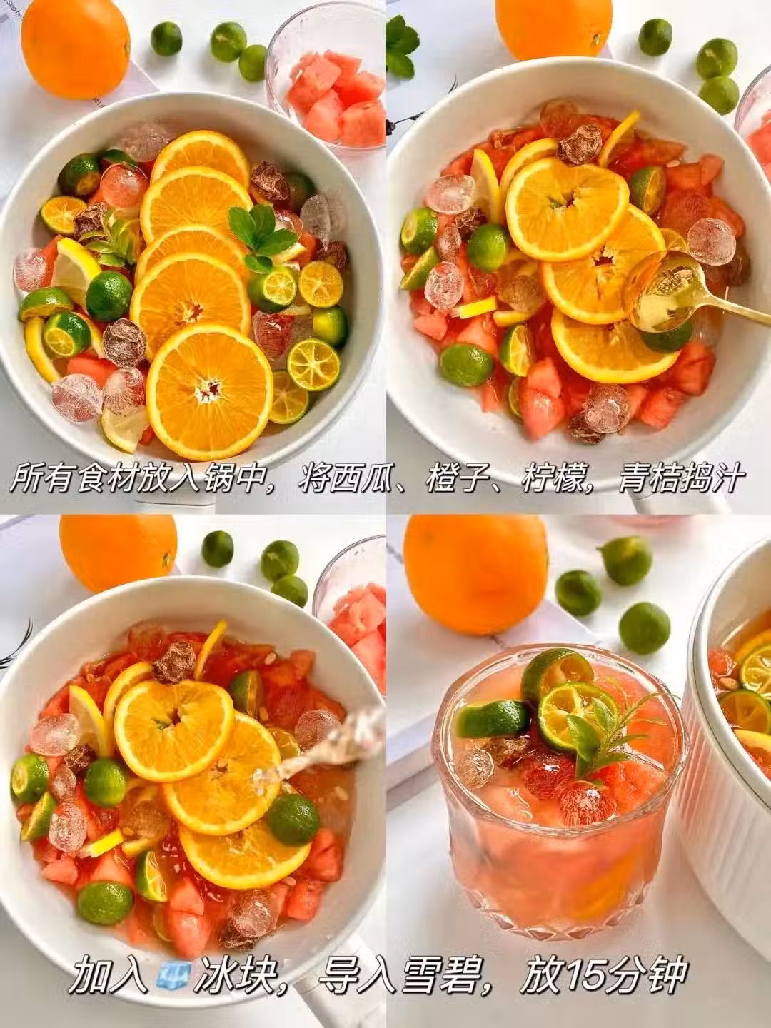1.橙子、青桔、檸檬用鹽水搓洗乾淨後,切成片,西瓜去皮後切成小塊