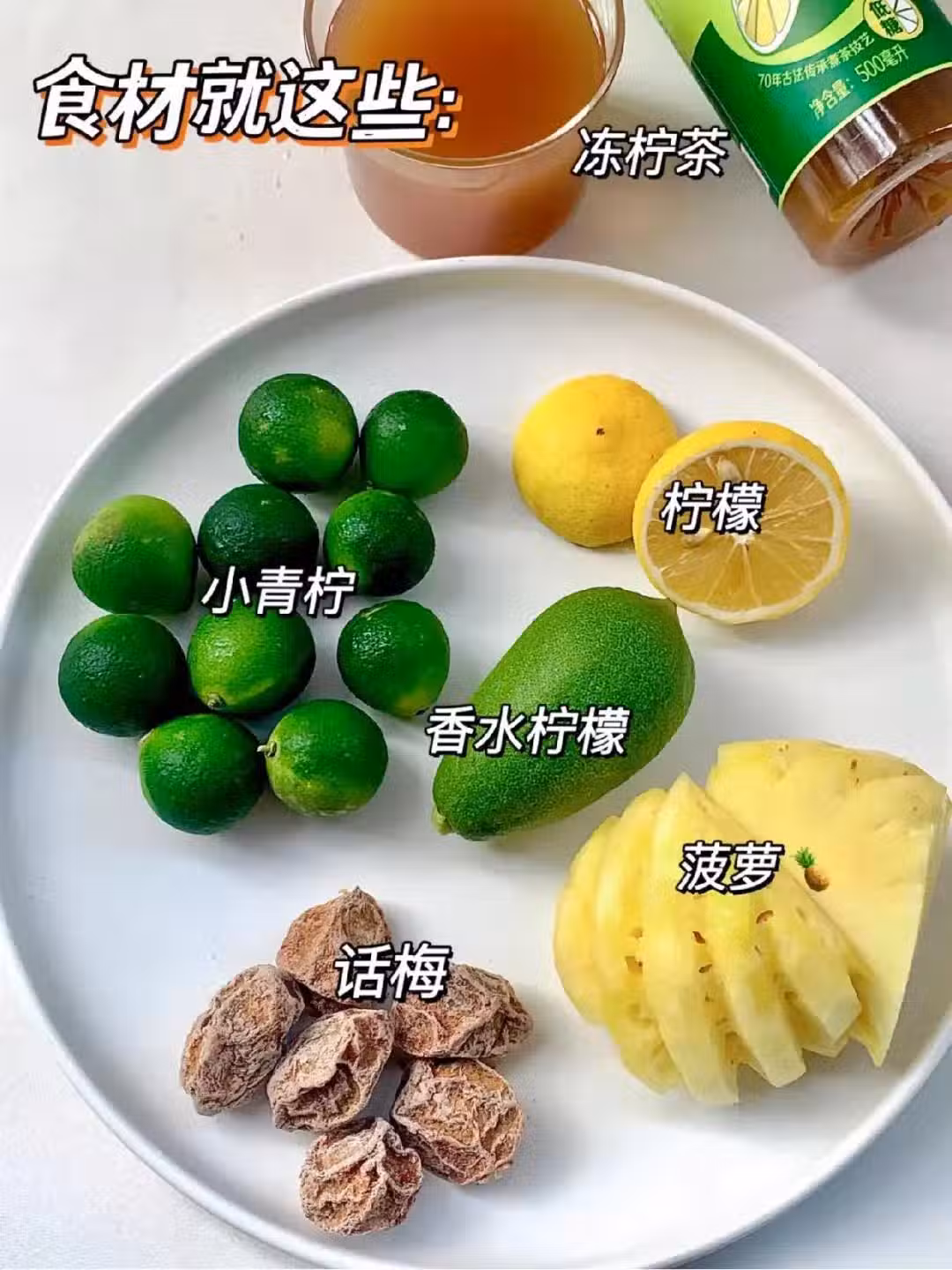 青桔100g,菠蘿120g,檸檬1個,話梅8顆,凍檸茶200ml