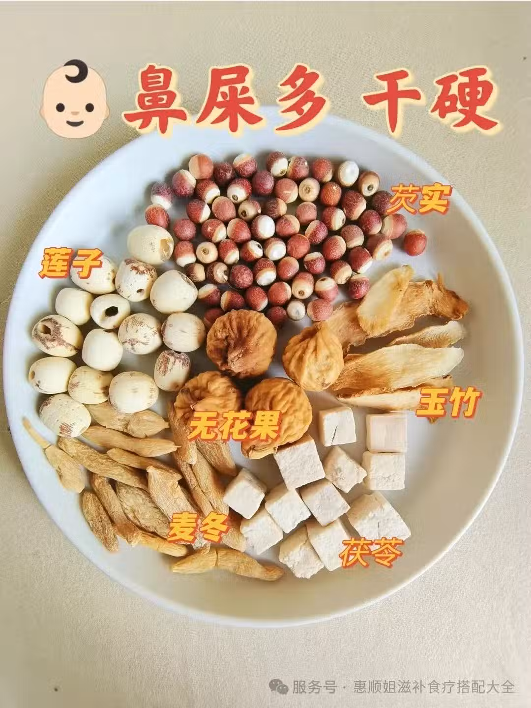 ✅鼻屎干硬:蓮子10克、芡實10克、無花果10克、玉竹10克、麥冬10克、茯苓10克