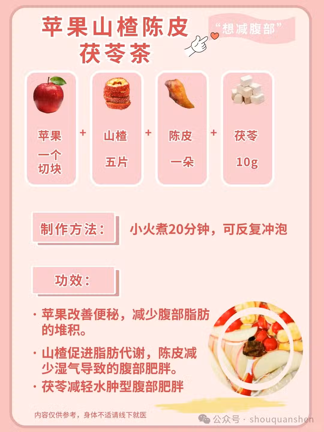 🍎 蘋果 + 山楂 + 茯苓 + 陳皮:蘋果有助於排毒,山楂幫助消食,茯苓去濕,陳皮則理氣。四者結合,完美幫助消除腹部贅肉,讓你的小腹恢復平坦。