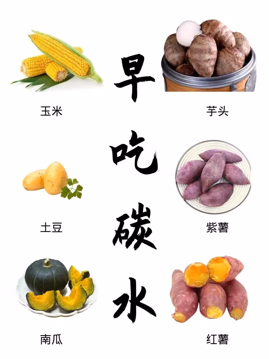 ☑️食材:玉米、南瓜、紫薯、紅薯、土豆、山藥、燕麥,小米、芋頭…注意⚠️不要攝入精細碳水,比如:麵條、米線…
