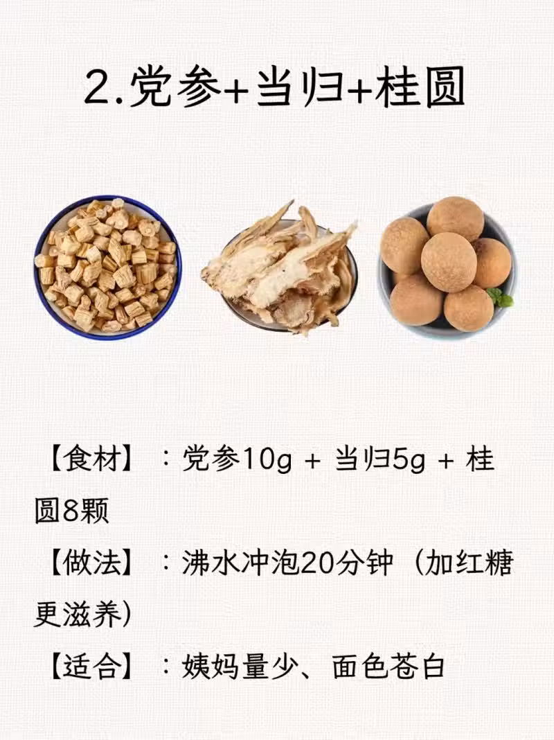 2. 黨參+當歸+桂圓:補氣血、養心神,改善氣血不足