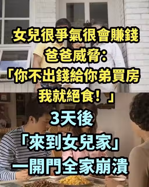 女兒很爭氣很會賺錢! 爸爸威脅:「你不出錢給你弟買房,我就絕食!」 3天後「來到女兒家...」一開門全家崩潰