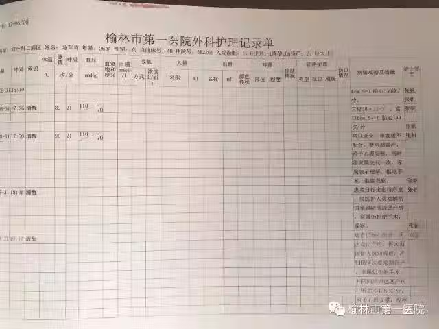 在榆林市第一醫院外科護理記錄單上顯示,17時50分,產婦向醫護人員提出剖腹產的要求,醫護人員徵求家屬意見時,家屬稱表示理解,但拒絕手術,繼續觀察。