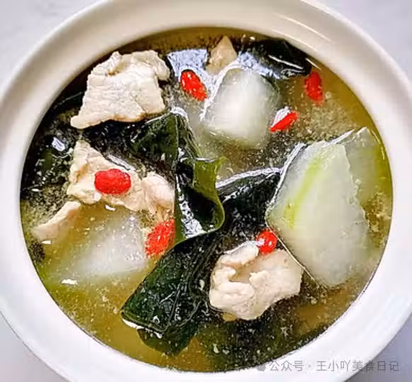 做法:海帶泡20分鐘,切小段,冬瓜去皮洗凈切塊,肉片腌制20分鐘燒熱水,下海帶煮約10分鐘,加入肉片、冬瓜,煮沸約5分鐘調味,出鍋。