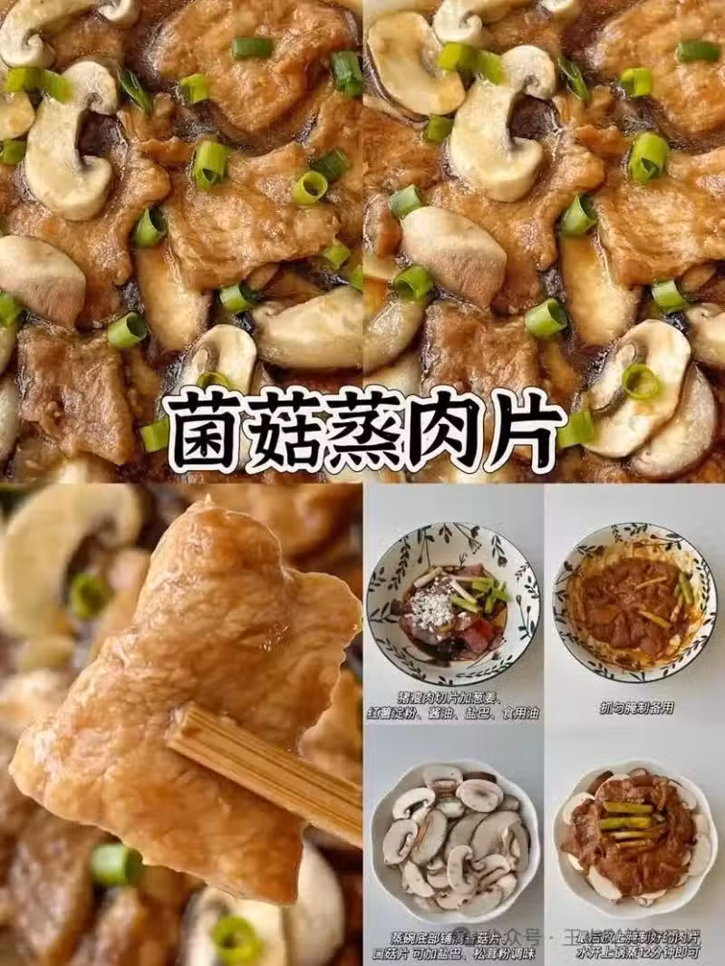 食材:豬瘦肉200克、香菇5朵、口蘑5朵、紅薯澱粉1勺、醬油1勺、鹽半勺、松茸粉少許(可選)、蔥姜適量