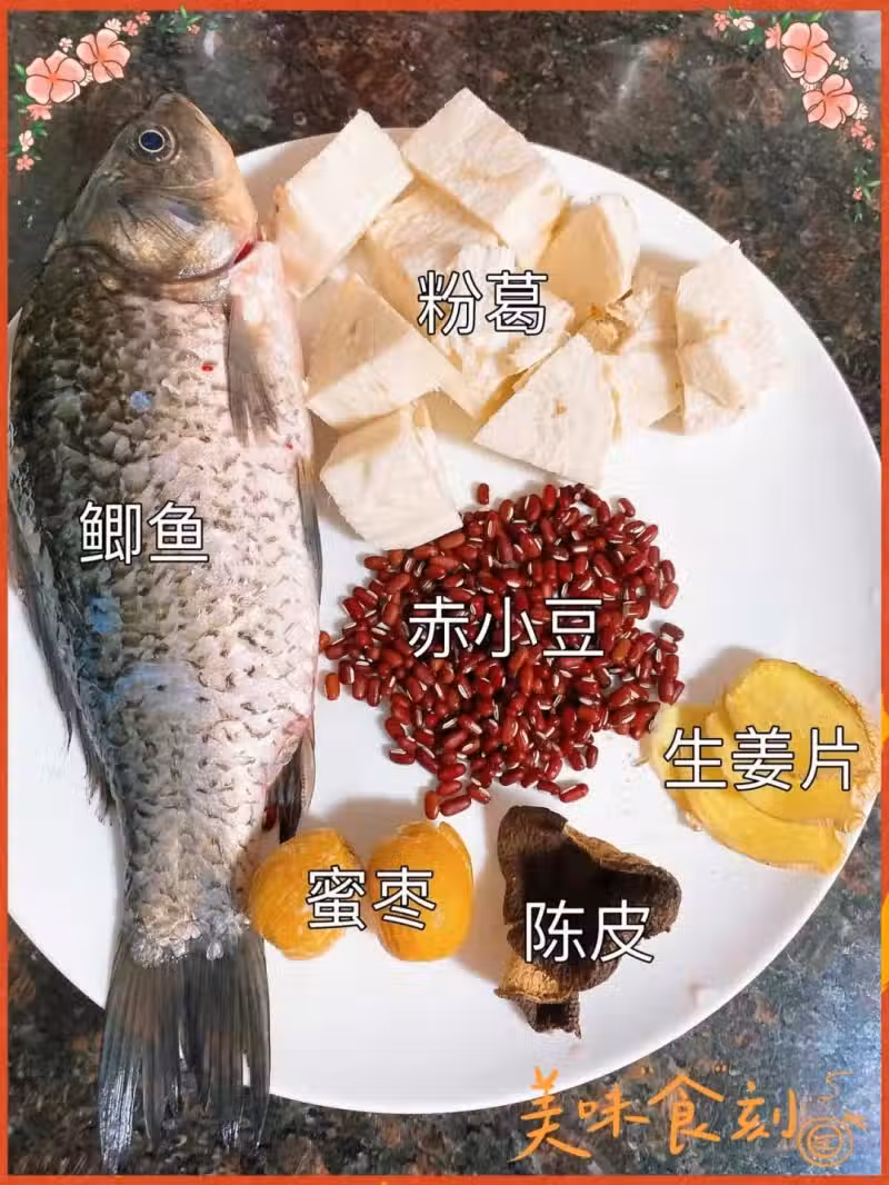 鯽魚1條(約500克)、粉葛400克、赤小豆30克、蜜棗2顆