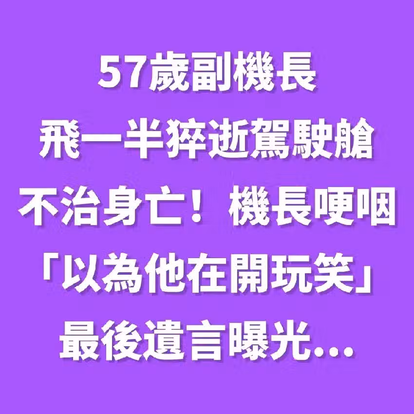 57歲副機長「飛一半猝逝駕駛艙」不治身亡!機長哽咽「以為他在開玩笑」最後遺言曝光...