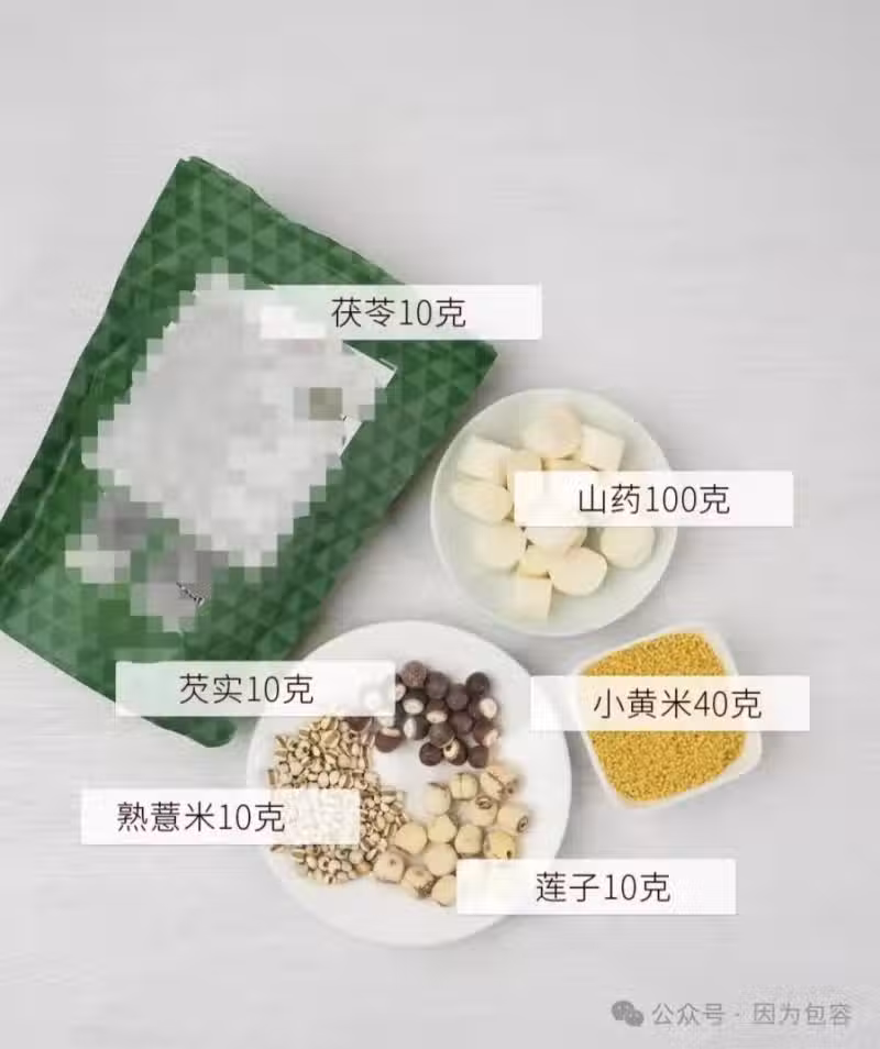 薏米 20g、茯苓 20g、小米 50g、干山藥片 10g、枸杞 10g