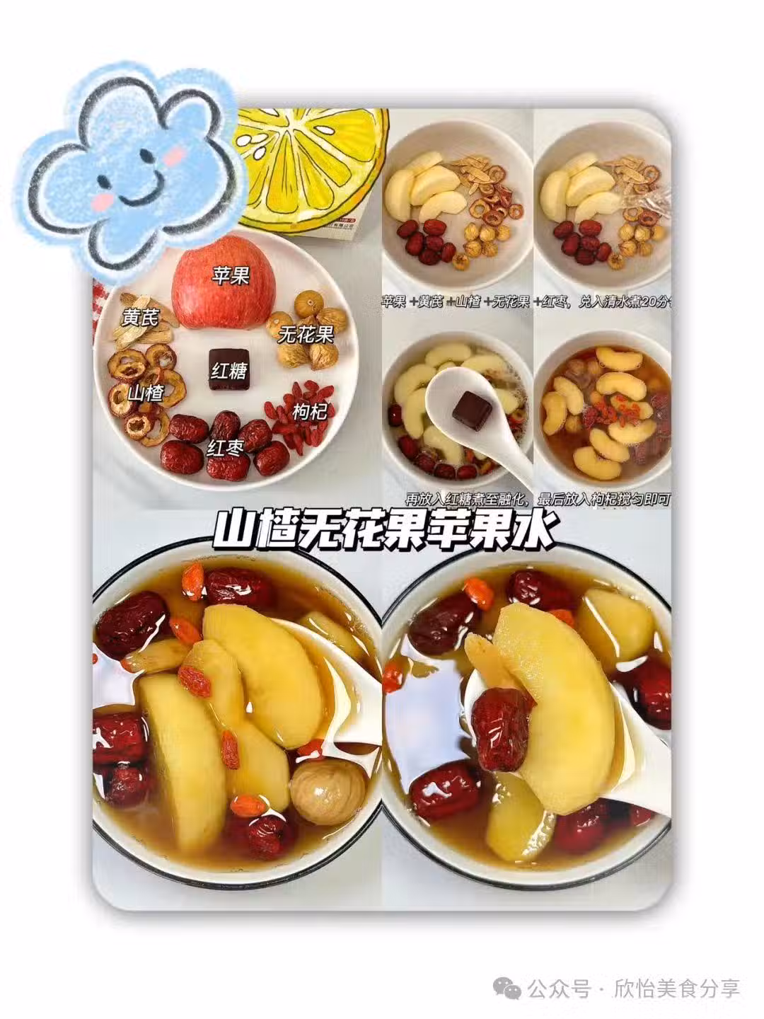 5、山楂無花果蘋果糖水準備食材蘋果,山楂,無花果,紅糖,紅棗枸杞,黃芪,蘋果加黃芪山楂和無花果加紅棗一起加入清水煮20分鐘,加入紅糖攪拌均勻撒上枸出鍋,這款對皮膚非常友好!
