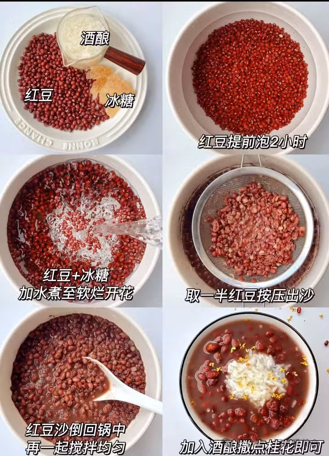 紅豆泡兩小時就夠了。加水和冰糖一起煮,煮到豆子軟爛開花。盛出一半紅豆,用勺子輕輕壓一壓,豆沙就出來了。把這豆沙倒回鍋里,和剩下的紅豆攪勻。最後舀幾勺甜酒釀進去,撒點干桂花,那香味一下就活了。