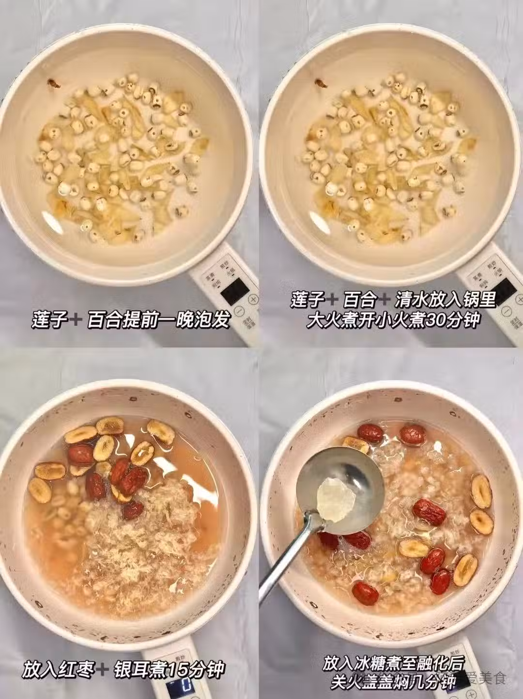 2.蓮子+百合+清水放入鍋里大火煮開,小火在煮30分鐘