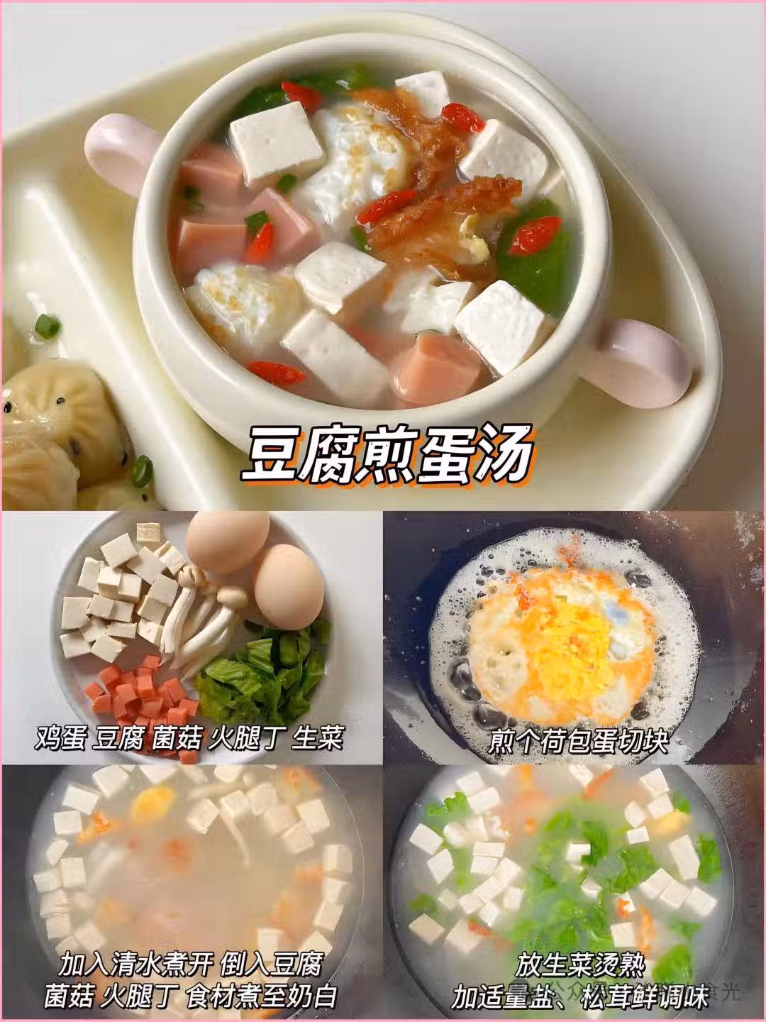 食材:雞蛋、豆腐、菌菇、火腿丁、生菜、清水