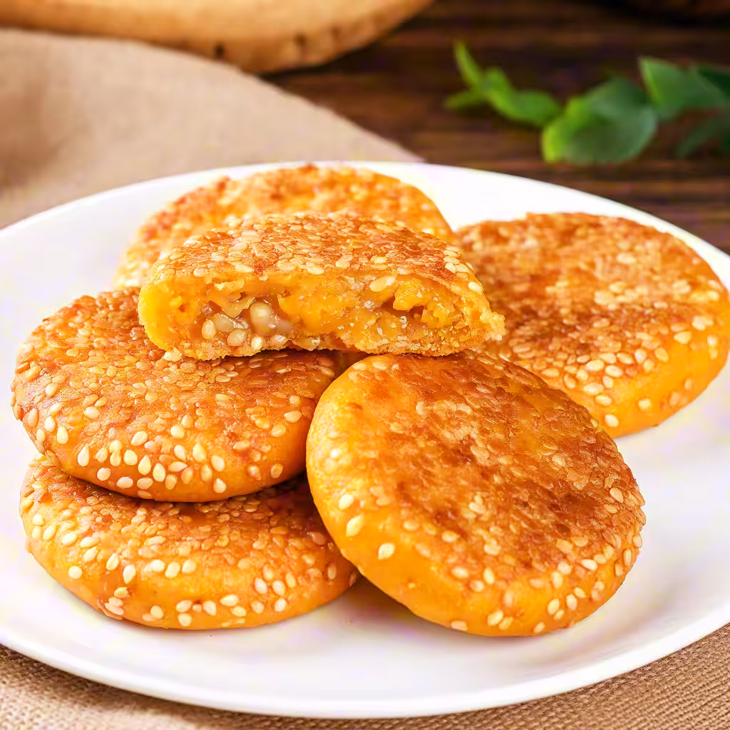 2. 分成小劑子,壓扁後裹滿白芝麻;