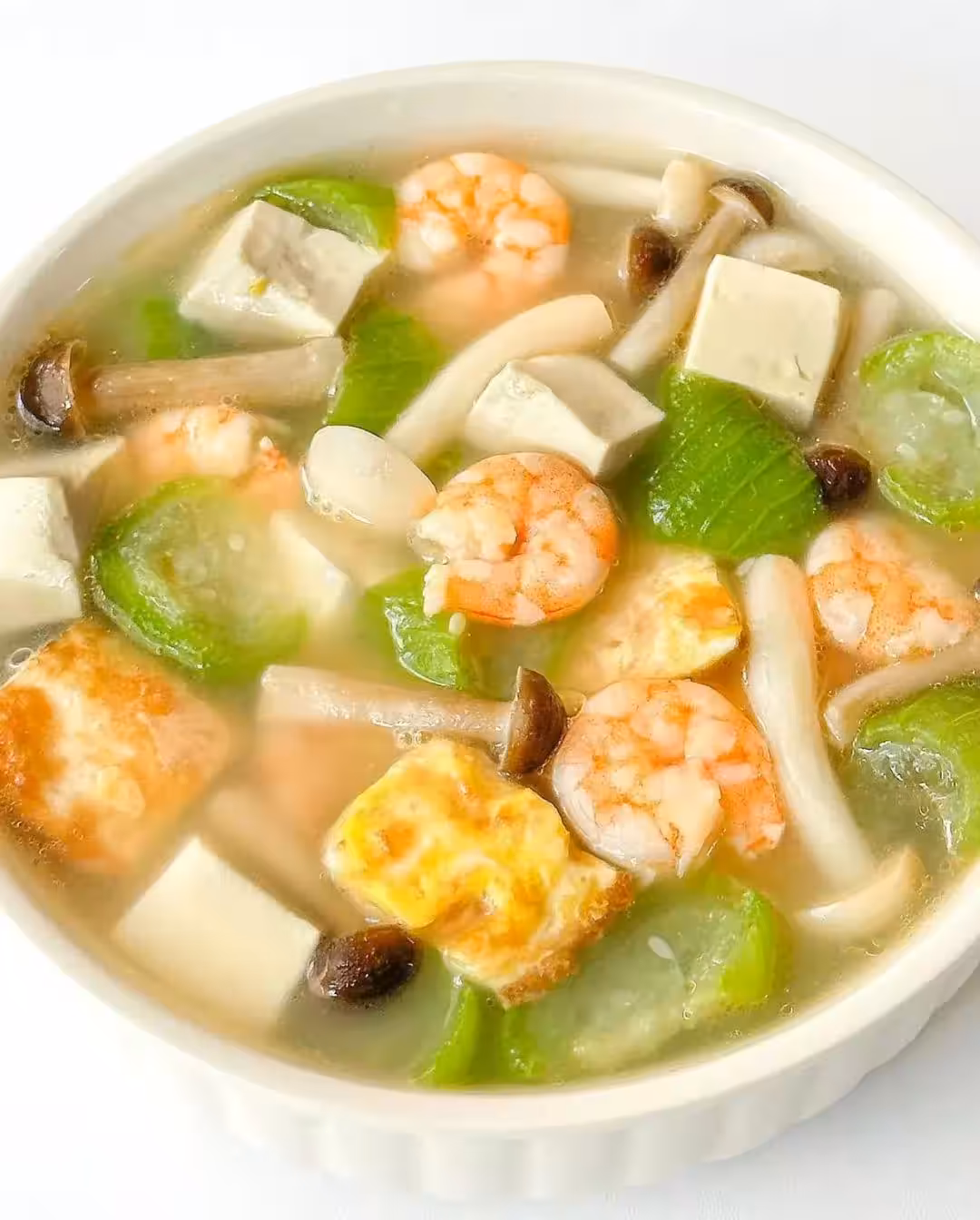 這湯在夏天喝真舒坦!又鮮又美,還一點都不膩。鮮蝦和豆腐,那都是補鋅的好東西,絲瓜甜絲絲的,菌菇滑嫩,再加上煎過的雞蛋,整碗湯營養又美味,鮮得不得了。這道絲瓜三鮮湯,食材簡單,搭配巧妙,喝一口就讓你忘不了。