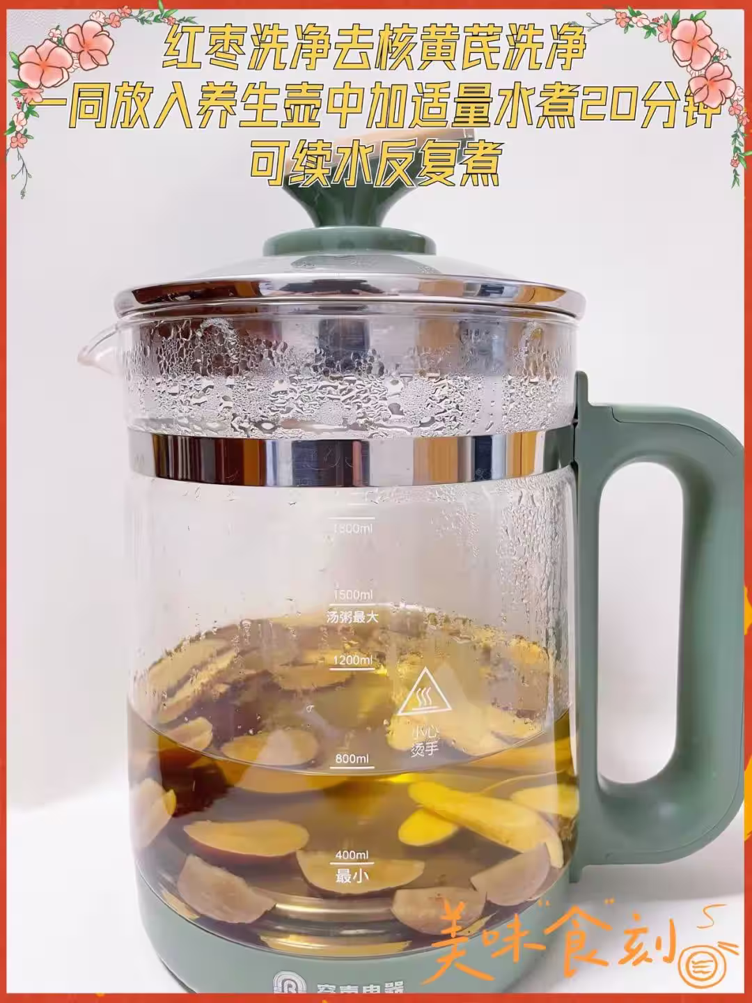 2. 黃芪用流水沖,和紅棗一起放進養生壺裡,加足夠的水,開火煮20分鐘就可以喝了。