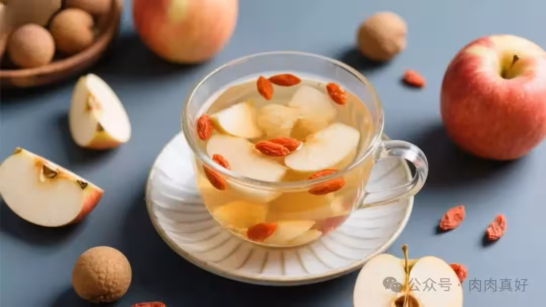 做法:蘋果1 個切小塊,桂圓 3 顆(把皮和核去掉)、枸杞 10 粒,加水煮 20 分鐘,當日常水喝,堅持喝段時間,氣色能好很多