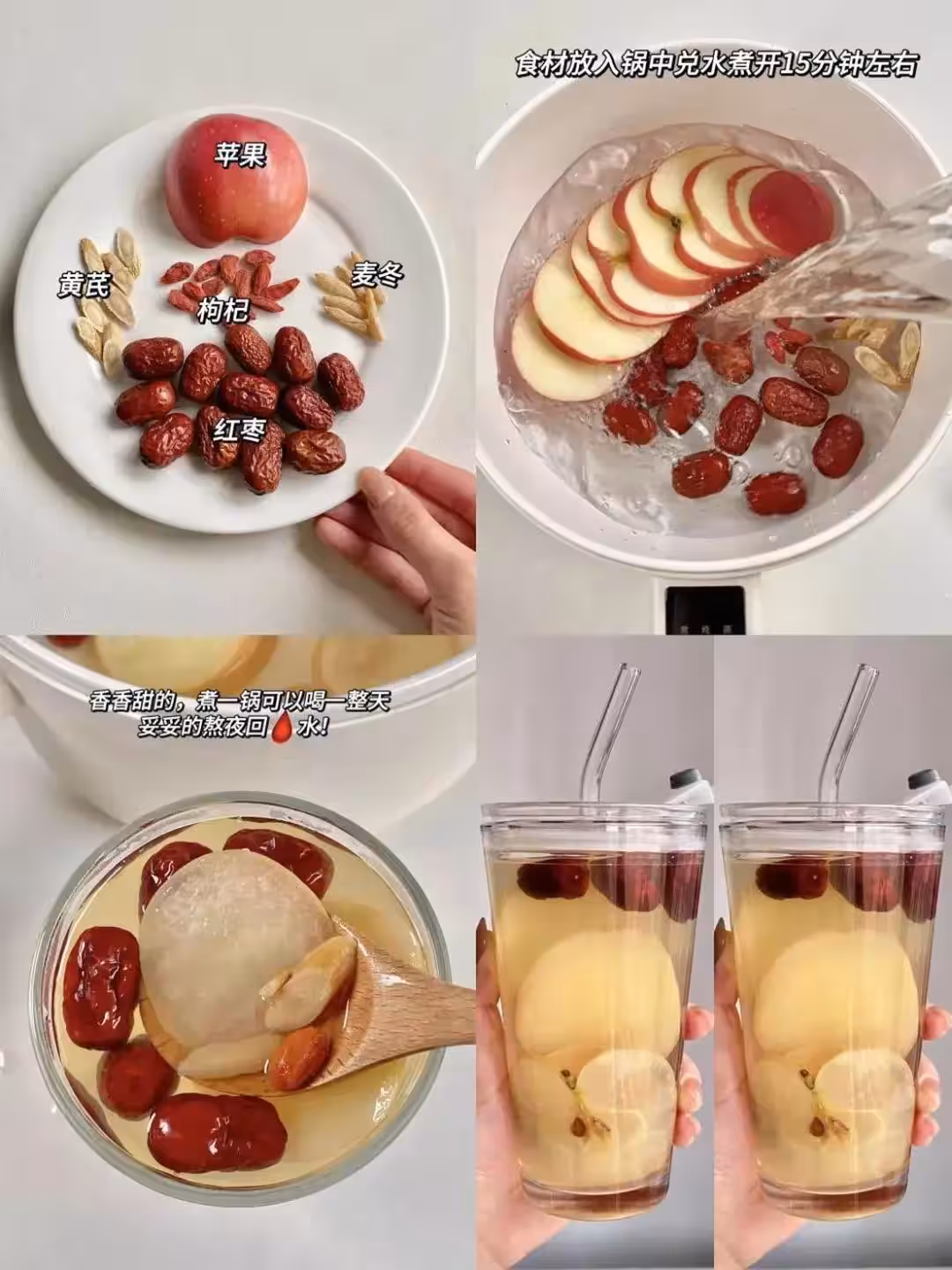 【食材】1個蘋果(帶皮切塊)、5g黃芪片(一定要選藥典標準的)、10粒麥冬、15顆寧夏枸杞、6顆紅棗(記得去核)、1.2L清水