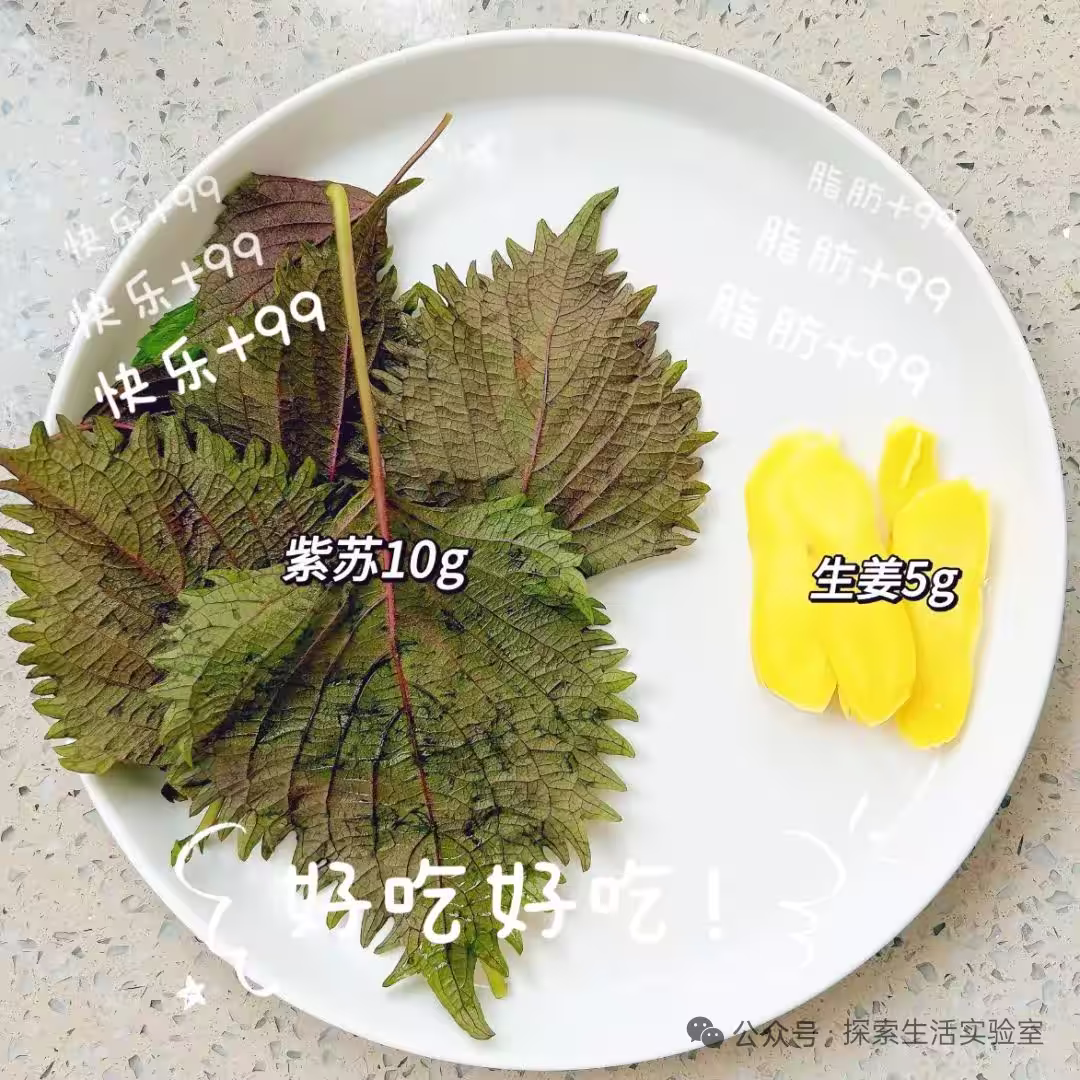 紫蘇葉1把(約15克)、老薑1塊(約30克)、紅糖2勺(根據口味調整)、清水800毫升