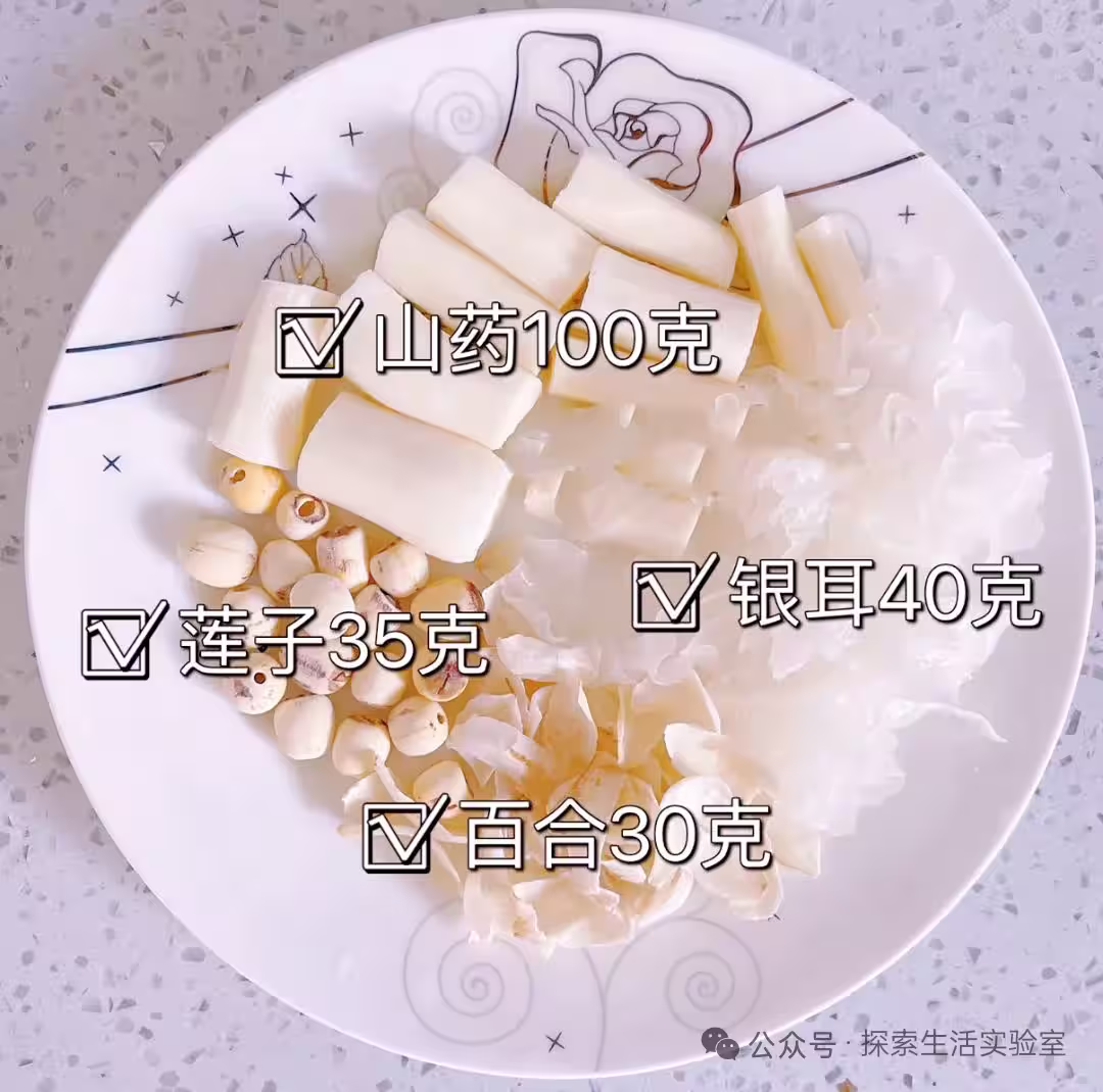蓮子30g、干百合15g、銀耳、鐵棍山藥1根、冰糖適量