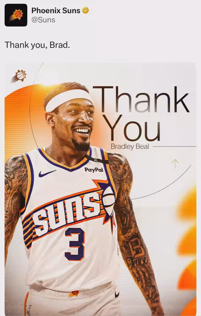是的,太陽直接裁員,並不奢求能用他換回什麼,儘管23年為了得到他付出巨大代價,當時將保羅+沙梅特+4個首輪互換權+6個次輪簽+現金送至奇才,得到比爾+古德溫+托德。
