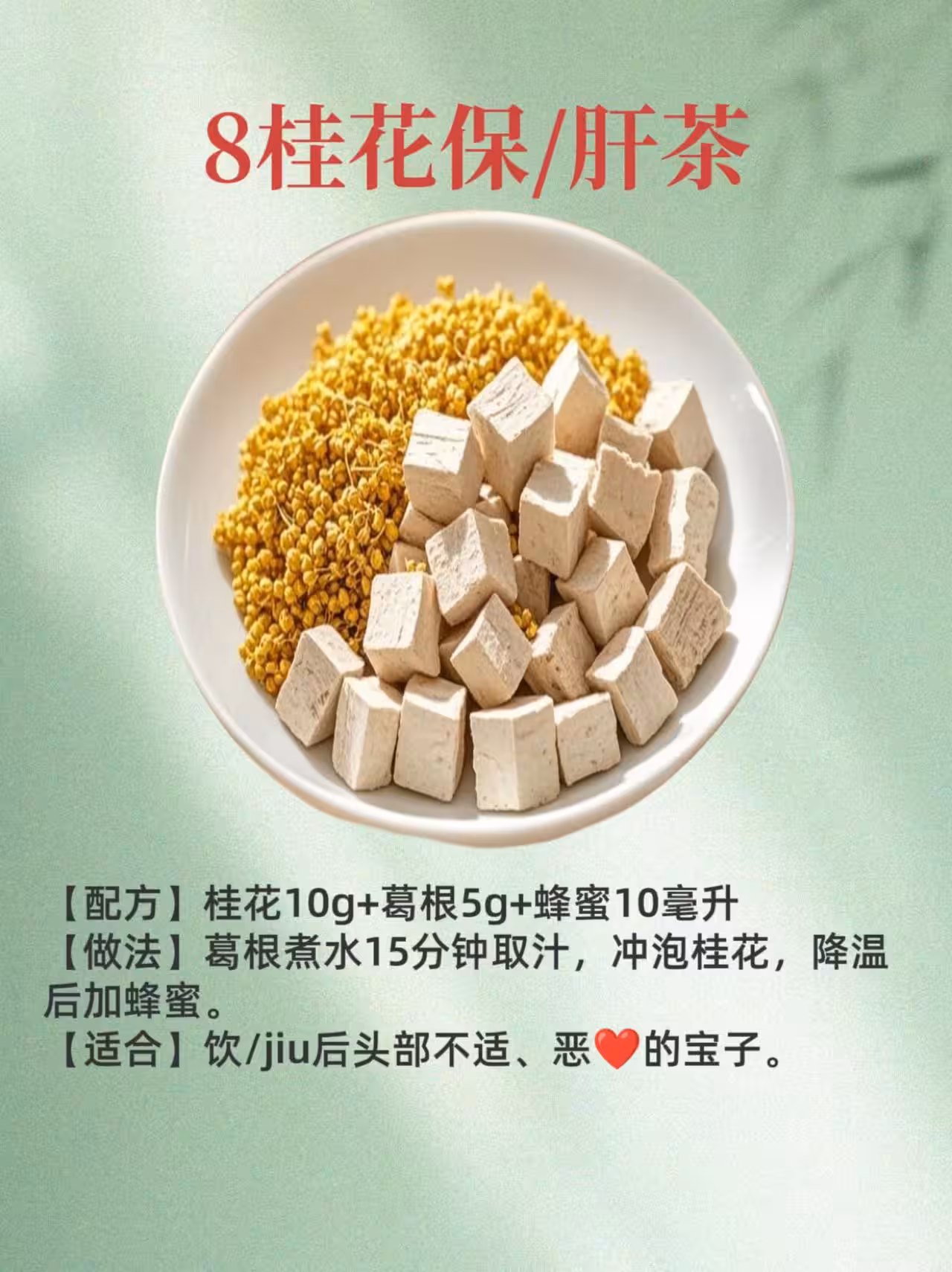 🌼桂花保/肝茶:飲/jiu後不適的寶子,試試這款保/肝茶。葛根煮水15分鐘取汁,沖桂花,降溫加蜂蜜,喝完肝/髒輕鬆多了,第二天也不難受啦~