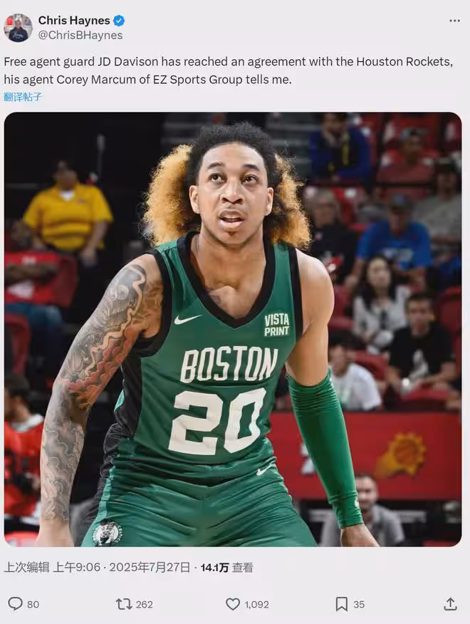 7月27日,火箭再次出手,連簽兩名雙向合同球員:以賽亞-克勞福德和JD-戴維森。這樣一來,火箭隊中三份雙向合同已滿,另外一人是凱文-哈里斯。目前火箭14份正式合同+3份雙向合同,理論上還有1個正式合同名額。