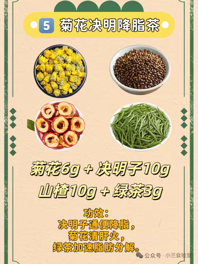 功效:決明子通便降脂,菊花清肝火,綠茶加速脂肪分解。