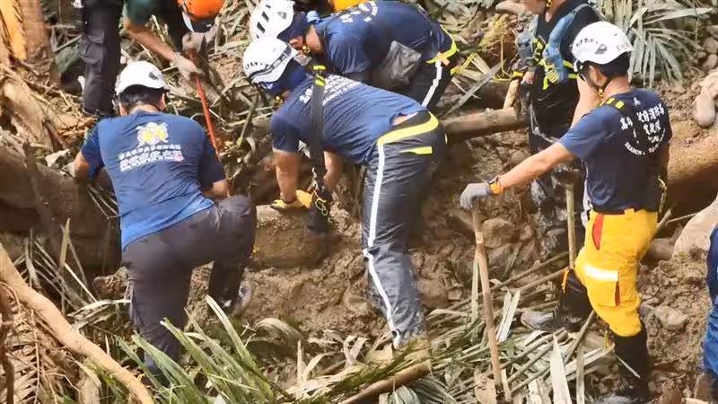 ▲由於大型機具目前還無法進駐,搜救隊在現場徒手搬運碎石及樹枝。(圖/翻攝畫面)