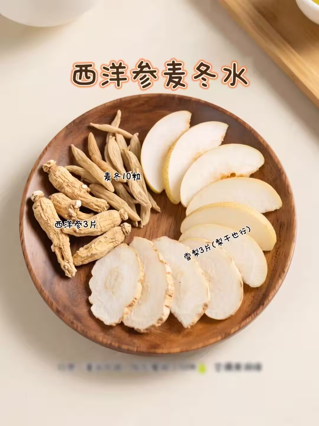 取三片西洋參,十粒麥冬。如果喜歡,還可以加三片雪梨乾(新鮮雪梨薄片也可以)。所有材料放進杯里或小壺,沸水衝下去,耐心燜上十五分鐘。