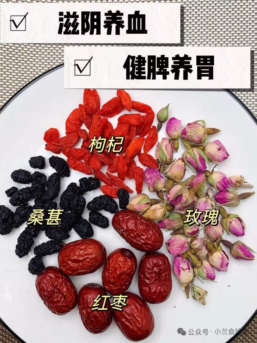桑葚枸杞滋腎陰,玫瑰花調和肝氣,紅棗健脾補血,適合熬夜後口乾舌燥、消化不良者,建議下午飲用避免桑葚寒涼。