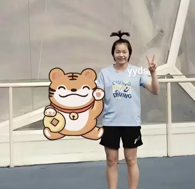 全紅嬋當時站著比耶,跟隊友們互動拍照,笑容還是甜甜的,但眼神里那股子對跳水的「狠」勁兒,根本藏不住。