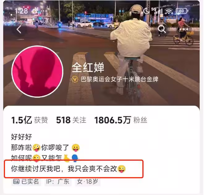 回擊網絡噴子?全紅嬋疑似發飆:你繼續討厭我吧 我只會爽不會改