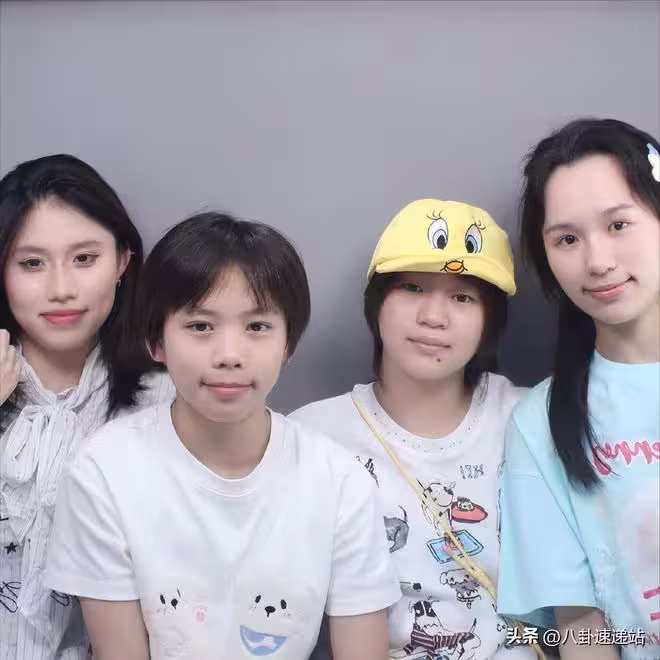全妹坐在中間,身上穿著白色長袖,衣服前面還有很多小狗圖案,特別可愛,一看就是十幾歲小姑娘愛穿的衣服。