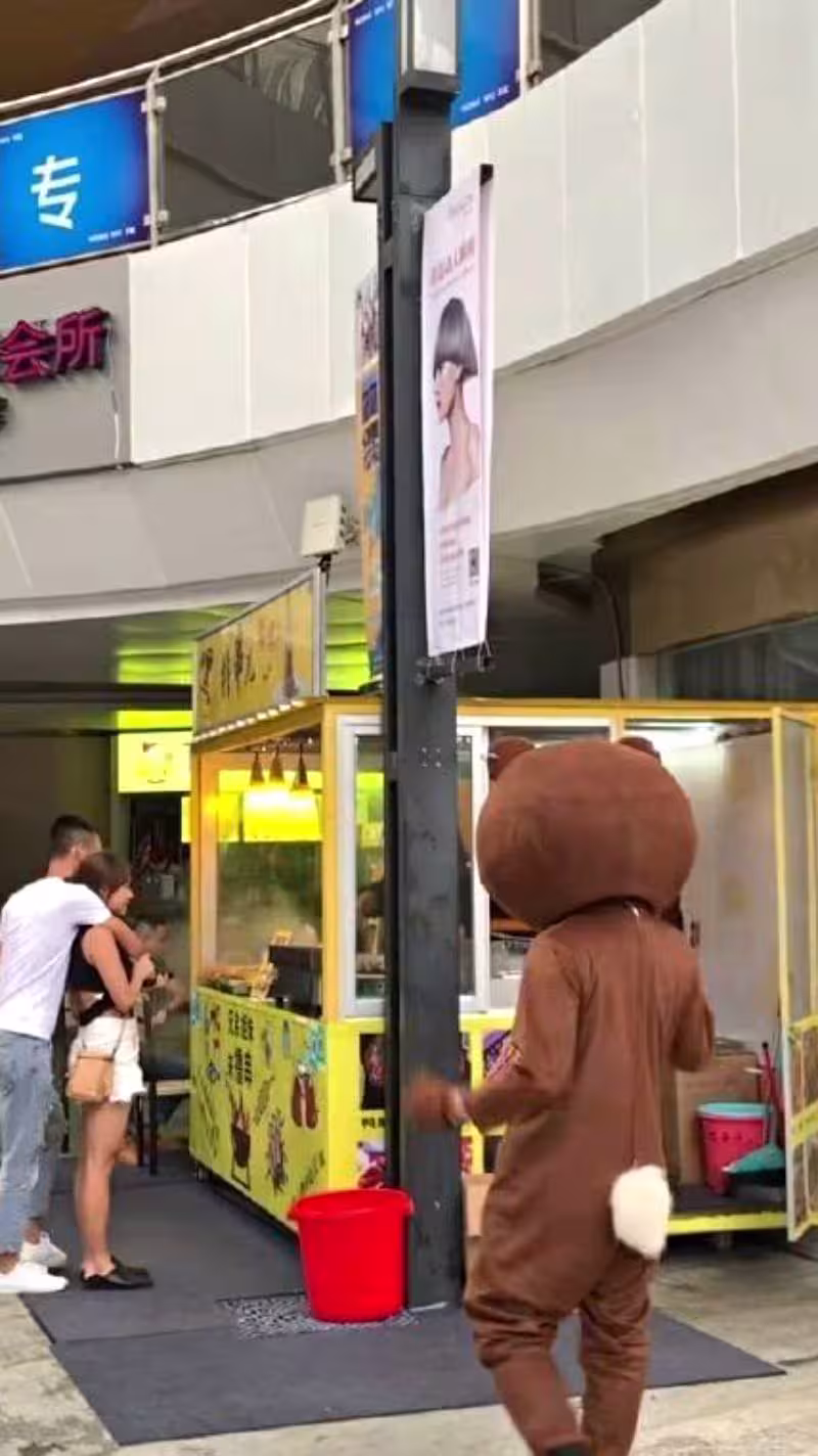只見一系列照片中,穿著熊玩偶裝的男主角出現在一個公眾場合中,