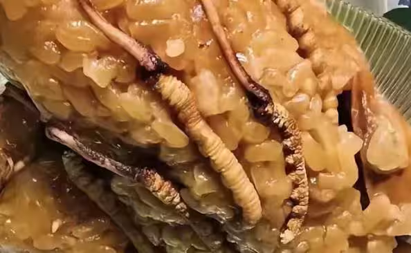 米糰中纏著數十根褐色條狀物,細看竟似蟲體橫臥其中,每條約半截小指長短,表面布滿環狀紋路,夾雜在糯米與肉塊之間呈現詭異造型。
