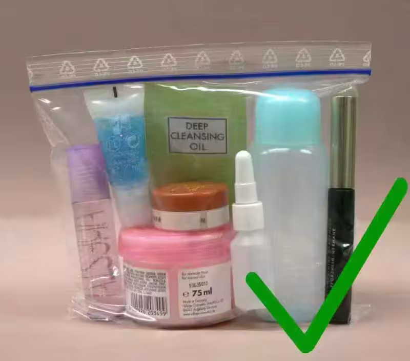 4. 每人限攜帶一袋 這項規定適用於如:牙膏、洗面乳、乳液、化妝水、香水、防曬、凝膠類護髮品,甚至是隱形眼鏡藥水!