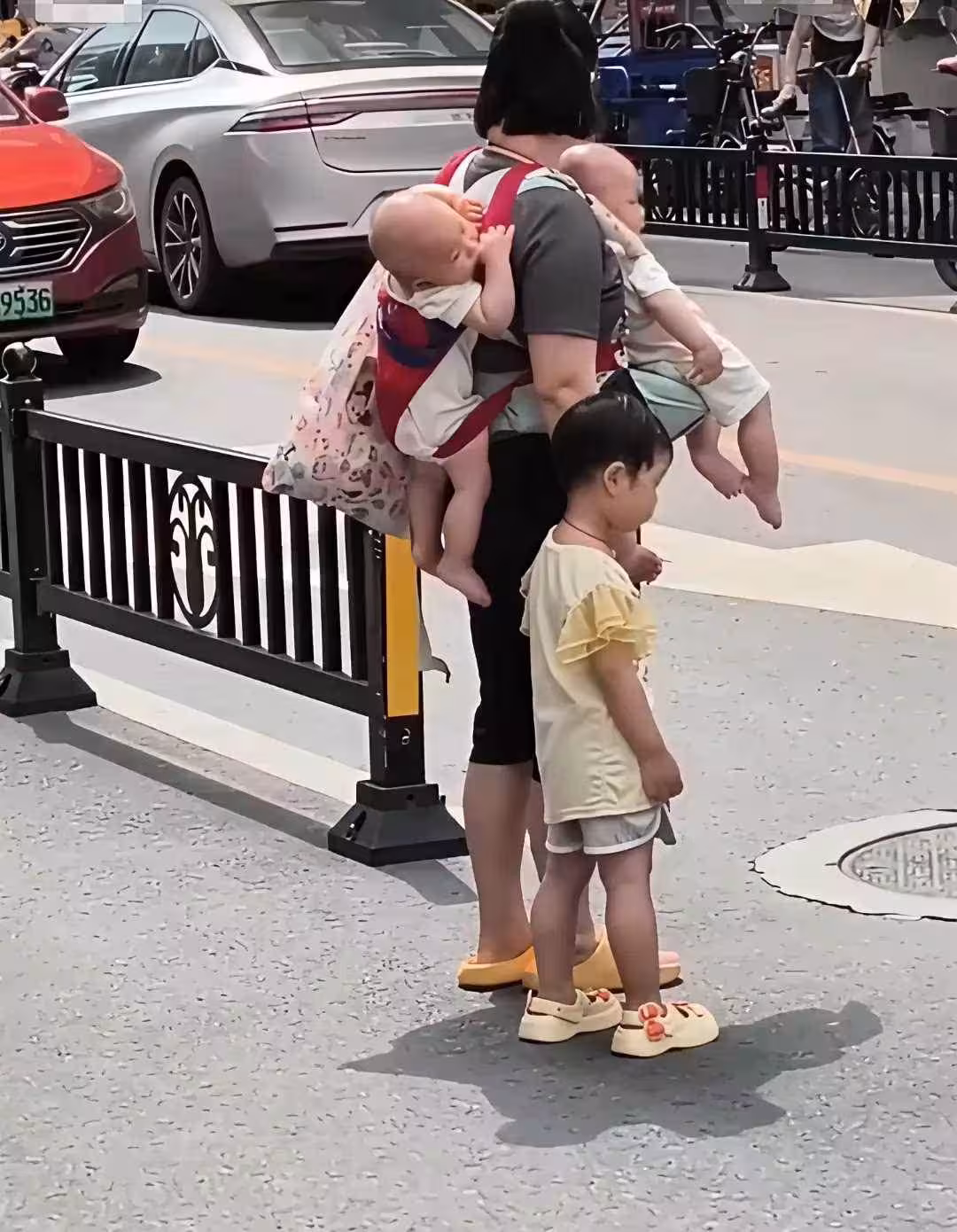 在城市的喧囂中,人來人往,每個人都有自己的故事。然而,最近在街頭拍到的一位母親,卻讓人不禁停下腳步,心中湧起一股複雜的情緒。這位母親獨自帶著三個孩子出行,右手牽著一個稍大的孩子,肩上扛著一個嬰兒,懷裡還抱著另一個年幼的孩子。她的神情專注而堅定,似乎在用盡全身的力氣,平衡著三個孩子的需求。