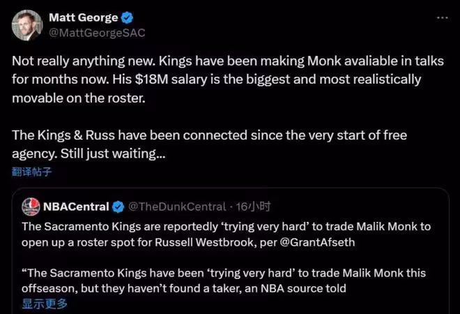 幾乎可以肯定的是,威少會在新賽季成為施洛德替補了。現在全聯盟都知道國王急於送走蒙克,大家觀望不是不想交易而是等待合適的價格,蒙克上賽季場均17.2分3.8籃板5.6助攻,他的1800萬薪資算是優質資產了,聯盟會有很多球隊想要。況且國王都放出這話了,雙方不可能再有合同可能,否則只會給更衣室帶來隱患,蒙克離隊是必然的。